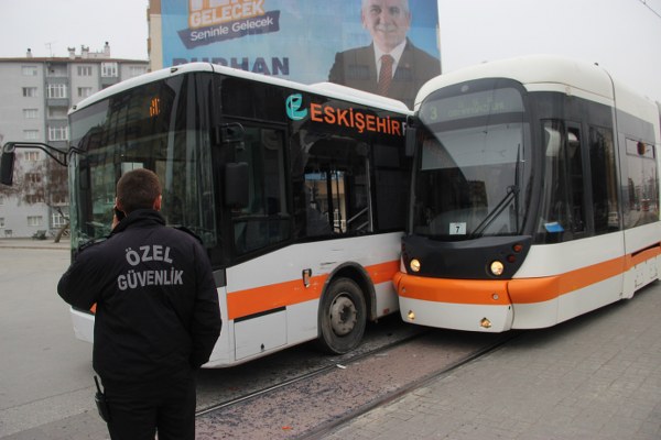 Eskişehir’de bir halk otobüsü ile tramvayın çarpışması sonucu maddi hasarlı kaza meydana geldi.