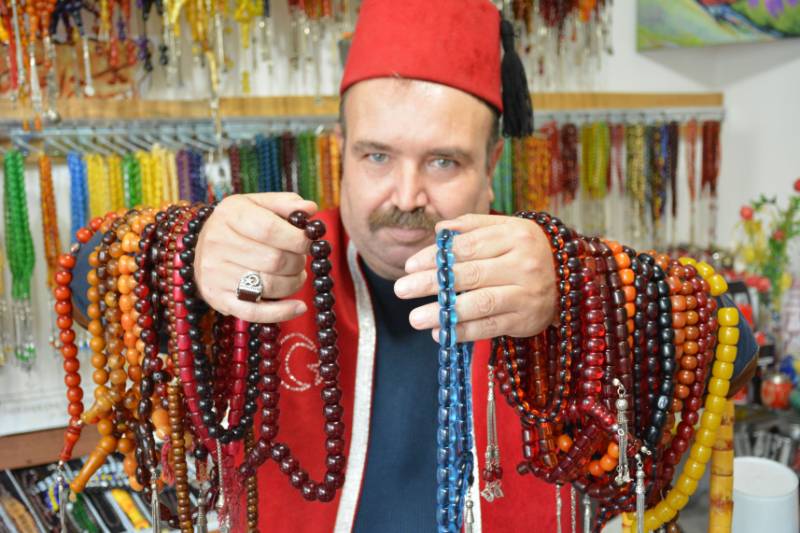 Sargın, “Bu tespih Alman sıkması olarak bilinen ilk tespihlerdendir. Almanlar ham maddesini değişik bir şekilde yapmışlar. Düğme olarak yapmışlar. Düğmeler renk verince bunu elbiselere çevirmişler. İlk çıkım malzemelerdendir. Şimdi objeler olarak piyasada var. Bu objeleri buluyorlar. 1909’lara, 1939’lara aittir. Bu malzemeler değişiktir. Bizim elimizde olan Alman sıkmasıdır. Alman sıkması kırmızı renktedir. Ateş kehribarı olarak geçer. Simsiyah olacaktır rengini aldığı zaman. Daha fazla değer kazanacaktır. Değeri yaklaşık olarak 200 bin lira civarıdır.