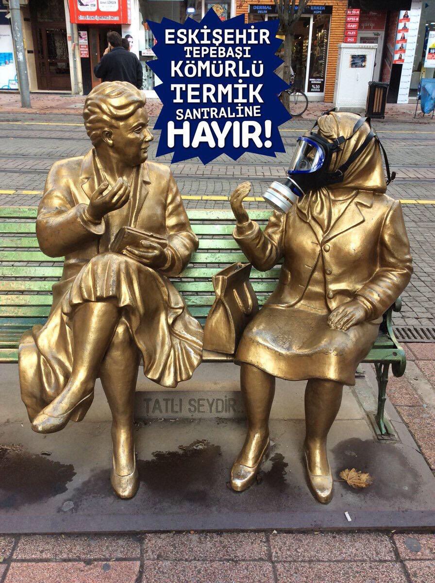 Eskişehir’de üniversite öğrencileri Alpu'ya yapılması planlanan kömürlü termik santrali protesto için şehirdeki bazı heykellere gaz maskesi giydirdi. Öğrenciler Türkiye'de gündeme oturan çekirdek çitleyen eşek heykeline de gaz maskesi taktı.