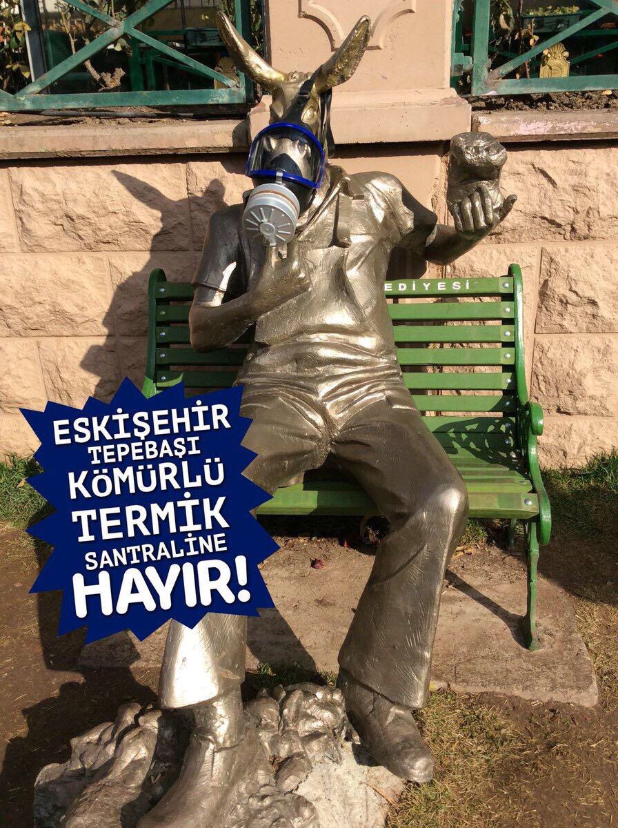Eskişehir’de üniversite öğrencileri Alpu'ya yapılması planlanan kömürlü termik santrali protesto için şehirdeki bazı heykellere gaz maskesi giydirdi. Öğrenciler Türkiye'de gündeme oturan çekirdek çitleyen eşek heykeline de gaz maskesi taktı.