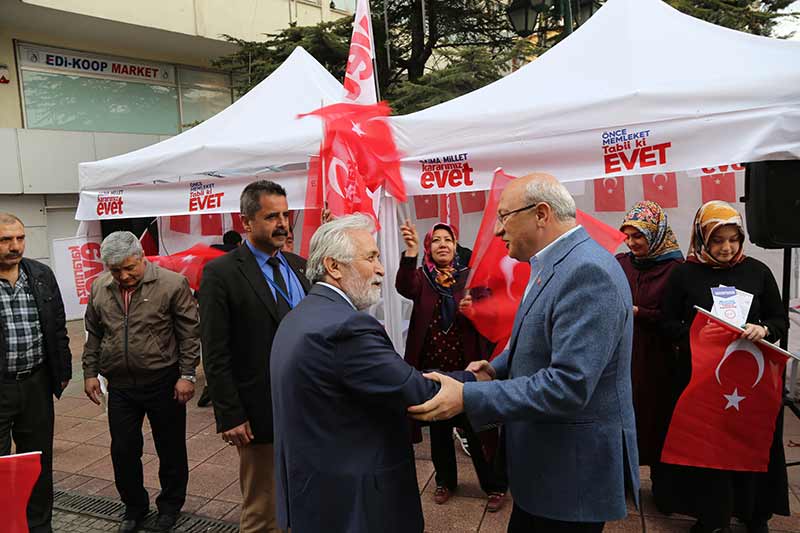Eskişehir'de, halk oylamasına yönelik kampanyalarını aynı caddede beş metre arayla kurdukları çadırda yürüten farklı görüşteki siyasi partilerin milletvekilleri, vatandaşlara anayasa değişikliğine ilişkin görüşlerini aktarıyor.
