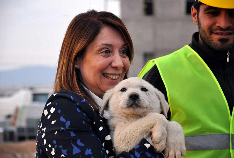 Kültür ve Turizm Bakanı Prof. Dr. Nabi Avcı’nın Beylikova ilçesi ziyaretine eşlik eden AK Parti Eskişehir Milletvekili Prof. Dr. Emine Nur Günay, yurt inşaatında görüp kucağına aldığı Golden cinsi ‘Fıstık’ isimli yavru köpeği dakikalarca sevdi.