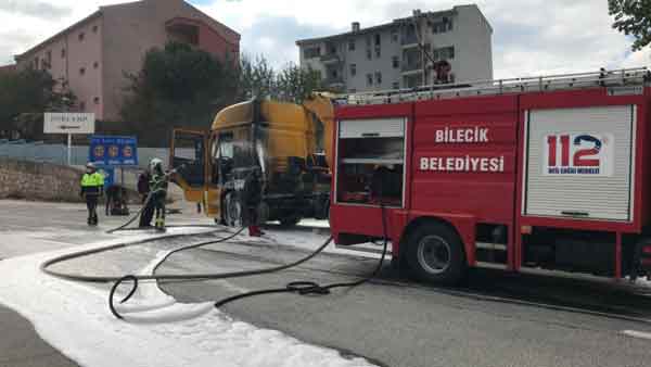 Bilecik'te sıcak asfalt yüklü tırın kupa kısmında çıkan yangın kısa sürede söndürülürken, aracın sürücüsü gözyaşları içinde yanan tırını dakikalarca izlemek zorunda kaldı.