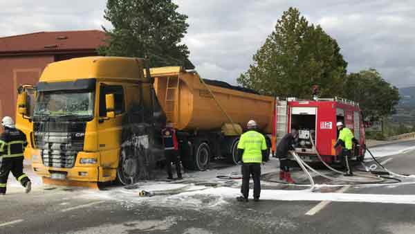 Bilecik'te sıcak asfalt yüklü tırın kupa kısmında çıkan yangın kısa sürede söndürülürken, aracın sürücüsü gözyaşları içinde yanan tırını dakikalarca izlemek zorunda kaldı.