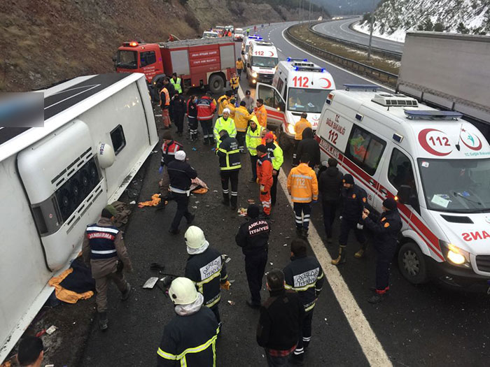 Anadolu Otoyolu'nun Ankara kesiminde yolcu otobüsünün devrilmesi sonucu iki kişi yaşamını yitirdi, 20 kişi yaralandı.