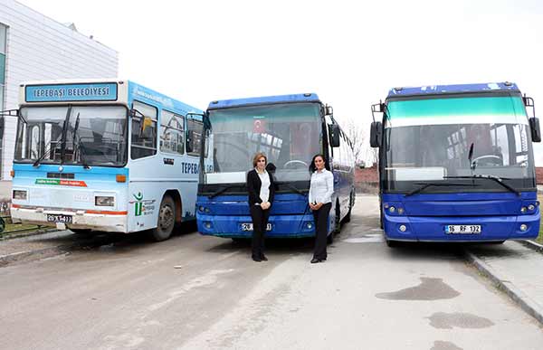 Eskişehir'de merkez Tepebaşı İlçe Belediyesi tarafından otobüslerde görev yapmaları için şoför kadrosuna alınan iki kadın, kent trafiğinde başarıyla direksiyon sallıyor.