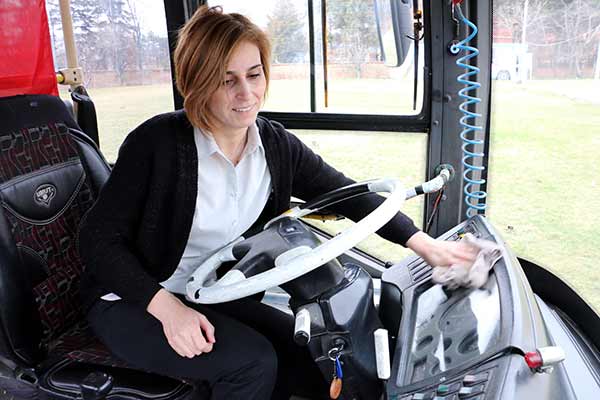 Eskişehir'de merkez Tepebaşı İlçe Belediyesi tarafından otobüslerde görev yapmaları için şoför kadrosuna alınan iki kadın, kent trafiğinde başarıyla direksiyon sallıyor.