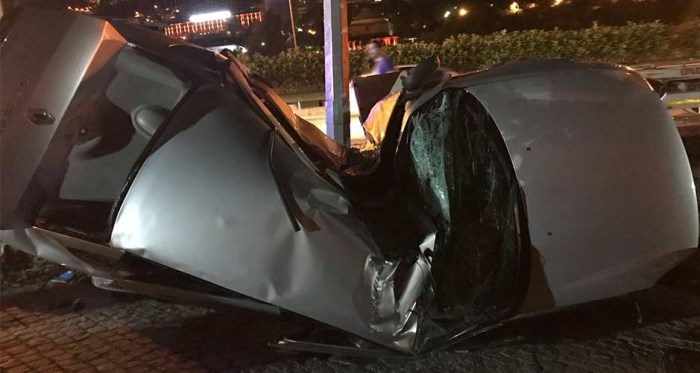 Bursa'da kontrolden çıkan otomobil aydınlatma direğine çarpıp hurdaya döndü.