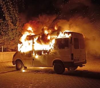 Kütahya’nın Gediz ilçesinde park halindeki minibüs alev alev yanıp demir yığınına döndü.