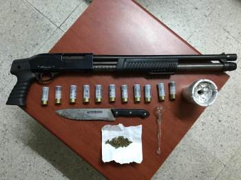 Araçta yapılan aramada 1 adet pompalı tüfek, tüfeğe ait 12 fişek, bir miktar uyuşturucu madde ve uyuşturucu madde içiminde kullanılan malzeme ile 1 adet bıçak ele geçirildi.