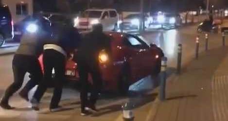 Merkez Nilüfer ilçesinde piyasada değeri yaklaşık 20 milyon TL olan Ferrari, henüz öğrenilemeyen bir sebepten dolayı yolda kaldı. Sürücü çevredekilerden yardım isterken, aracı iterek yol kenarına çektiler. Çevredeki vatandaşlar ise olan biteni hayretle izledi.