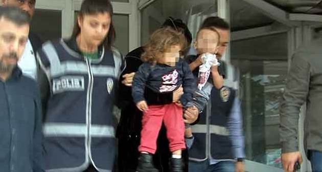 Emniyetteki işlemleri tamamlanan Tuğba D., emniyet çıkışında kucağındaki çocuklarıyla yüzünü kapatarak gizlenmeye çalıştı.
