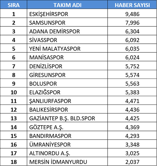 Medya Takip Ajansı Interpress’in üç bine yakın ulusal, bölgesel ve yerel gazete ile dergiyi kapsayan haber araştırmasına göre, sezonun başladığı Ağustos ayından bu yana  spor sayfalarında en çok konuşulan takım Eskişehirspor oldu. Kırmızı Siyahlı ekip hakkında, yazılı basında toplam 9 bin 486 haber çıktığı belirlendi. Haber araştırmasının ikinci sırasında ligde kötü günler geçiren Samsunspor yer alırken, Karadeniz temsilcisi ile ilgili yazılı basına 7 bin 996 haber yansıdığı tespit edildi. Üçüncü sırayı ise Adana Demirspor alırken, Güney ekibinin yazılı basında 6 bin 304 haberle gündeme geldiği saptandı.