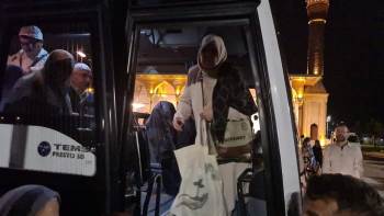 Aileleriyle vedalaşan hacı adayları, Medine’ye gitmek üzere otobüsle Zafer Havalimanı’na uğurlandı.