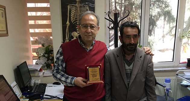 Op. Dr. Ahmet Bozkurt ve hastası Sadık Ulusoy, plaket ile bir fotoğraf çekinerek bu özel anı ölümsüzleştirdi.
