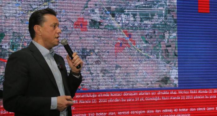 Acil olarak kentteki deprem riskine karşı çözümler üretilmesi gerektiğini belirten Hatipoğlu, “İlimiz merkezinde yer alan belediyelerin sorumluluğu altında kentsel dönüşüm alanları yer almakta olup, Büyükşehir Belediyesinin teklifi ile onaylanan Riskli Alan içerisinde, toplam bina sayısı bin 206, toplam hane sayısı 4 bin 500, etkilenen nüfus 14 bin 351 kişidir. Odunpazarı Belediyesinin teklifi ile onaylanan Gündoğdu Riskli Alanı içinde Toplam bina sayısı 774 adet, Toplam hane sayısı bin 91 adet, Yaklaşık nüfus 4 bin 364 kişidir. Yine Odunpazarı Belediye Başkanlığının teklifi ile onaylanan küçük sanayi riskli alanında Toplam iş yeri sayısı 1800 adet, toplam konut sayısı 440 adettir. Bunun yanında Belediye Kanunu kapsamında kentsel dönüşüm alanı ilan edilmiş olan Gündoğdu1, 2, 3 alanları yaklaşık 40 ha alan büyüklüğündedir. Özetle ilimizde riskli alan ilan edilmiş yaklaşık 150 hektar alan, kentsel dönüşüm alanı ilan edilmiş 40 hektar alan olmak üzere 190 hektarlık alanda bunca yıl geçmiş olmasına rağmen günün sonunda, 25 yıllık belediyeciliğin sonunda epi topu 3 adet blok dikilmiştir” dedi.