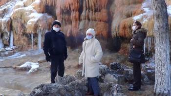 İzmir’den tatil için Hüdai Kaplıcalarına gelen Sema Gökyer, “Şifa Şelalelerinden akan sıcak suyun donması buraya ayrı bir güzellik katmış. Çok güzel bir görsel oluşmuş. Burayı çok seviyoruz ve burada olmaktan çok mutluyuz. Odalarımız pandemi dönemi olduğu için herkes kendi alanında odalarda kalıyor. Ortak alanlar kapalı kaplıcalar temiz ve hijyenik” dedi.