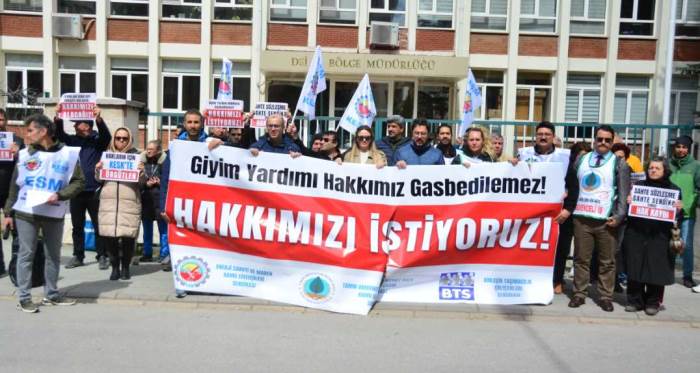 Enerji, Sanayi ve Maden Kamu Emekçileri Sendikası (ESM), Tarım ve Ormancılık Hizmet Kolu Kamu Emekçileri Sendikası (Tarım Orkam Sen) ve Birleşik Taşımacılık Çalışanları Sendikası (BTS) üyeleri giyim yardımı hakları için basın açıklamasında bulundu. DSİ 3. Bölge Müdürlüğü önünde bir araya gelen sendika üyeleri adına açıklama yapan ESM İI Temsilcisi Gökhan Soysal, “Siyasal iktidar kamu emekçilerinin haklarına yönelik saldınlara, hak gasplarına devam ediyor. KİT’lerde ve kamu kurumlarında emekçilerin giyim yardımı hakkı Hazine ve Maliye Bakanlığı'nın kurumlara 8 Mart'ta yazmış olduğu tehdit dolu yazı gerekçe gösterilerek gasbedilmek isteniyor” dedi.