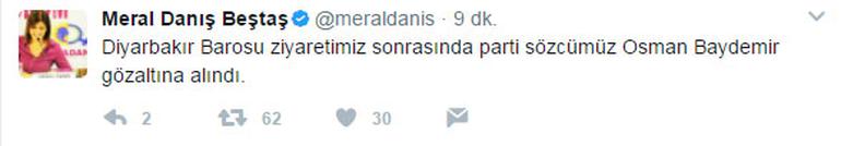 Baydemir’in gözaltına alındığını HDP Adana Milletvekili Meral Danış Beştaş Twitter hesabından şu sözlerle duyurdu: