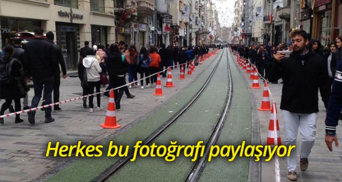 Taksim'de İstiklal Caddesi'ndeki yenileme çalışması devam ediyor. Bugün tramvay hattına yeşil çuha döşendi. İstiklal'den geçenlerin ilgisini çeken bu görüntü sosyal medyada da pek çok paylaşım aldı.