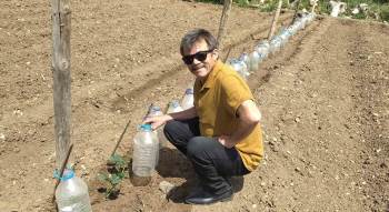 Gün, " Mayıs ayı sonuna kadar kırağı veya don tehlikesi devam sürdüğü yöremizde erken ürün elde etmek istiyorsanız sera kurmanız ya da sebze fidelerinin üzerini naylon örtü ile kapatmanız gerekir. Bu da maliyetli bir iş, zaten kendi ihtiyacım kadar sebze ekimi yapıyorum. Bu nedenle Nisan ayında ekimini yaptığım özellikle domates ve salatalık fidelerini zirai don ve kırağıdan korumak amacıyla yıl boyu biriktirdiğim 5 litrelik pet şişelerin altlarını keserek fidelerin üzerine yerleştirdim. Böylece sıfır maliyetli pet şişeyle korunan sebze fideleri soğuktan etkilenmiyor. Soğuktan etkilenmeyen sebze fideleri pet şişelerin içerisinde çok güzel gelişiyor. Hava sıcaklıklarının artmasıyla pet şişeleri kaldıracağım" dedi.