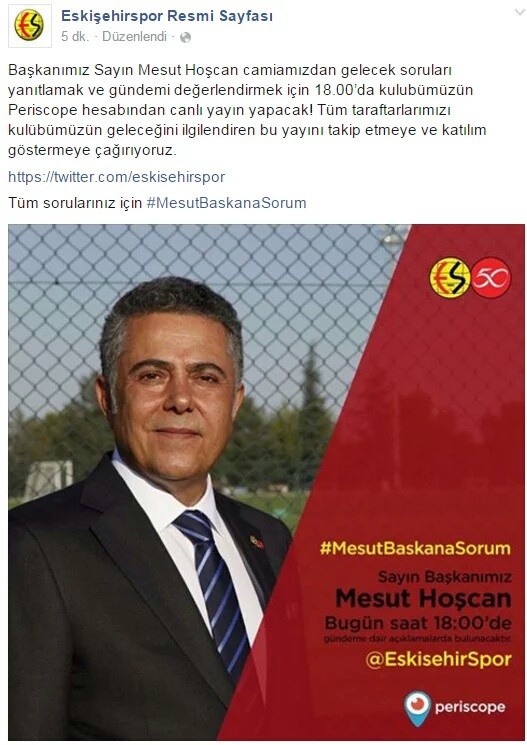 “Başkanımız Sayın Mesut Hoşcan camiamızdan gelecek soruları yanıtlamak ve gündemi değerlendirmek için saat 18.00’de kulubümüzün Periscope hesabından canlı yayın yapacak. Tüm taraftarlarımızı kulübümüzün geleceğini ilgilendiren bu yayını takip etmeye ve katılım göstermeye çağırıyoruz.”