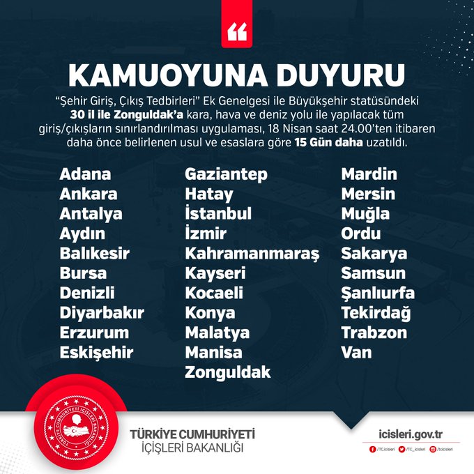 Bakanlığımız, 81 İl Valiliğine gönderdiği Şehir Giriş, Çıkış Tedbirleri ek genelgesi ile büyük şehir statüsündeki 30 il ( Adana, Ankara, Antalya, Aydın, Balıkesir, Bursa, Denizli, Diyarbakır, Erzurum, Eskişehir, Gaziantep, Hatay, İstanbul, İzmir, Kahramanmaraş, Kayseri, Kocaeli, Konya, Malatya, Manisa, Mardin, Mersin, Muğla, Ordu, Sakarya, Samsun, Şanlıurfa, Tekirdağ, Trabzon, Van) ile Zonguldak’a kara, hava ve deniz yolu ile (toplu ulaşım aracı, özel araç vb) yapılacak tüm giriş/çıkışlar, bu gece saat 24.00’dan itibaren daha önce belirlenen usul ve esaslara göre 15 gün daha uzattı.