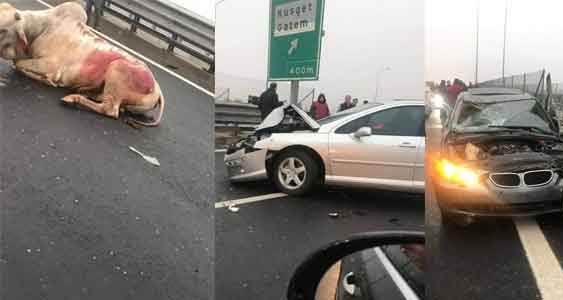 Gaziantep'te TIR'dan düşen ineğe karayolunda art arda 2 otomobil çarptı. Kazalarda ağır yaralanan inek, sahibi tarafından kara yolunda kesildi.