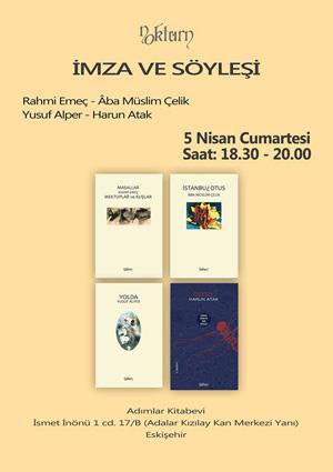 Eskişehirli şair Rahmi Emeç, yeni kitabı “Masallar Mektuplar ve Kuşlar” adlı öykü kitabının heyecan ve hazzını yaşıyor. Yaklaşık birkaç ay önce çıkan kitabın ilk tanıtımını ES TV’de “Sabah Kahvesi” programında sevenlerine açıklayan Emeç farklı bir deneme olarak nitelemişti kitabını. Sevgiyi Dağlara salacağım, Ertelenmiş Düşler Kitabı, Kırık Zihinler Sahafı ve Bakışsız Gece’den sonra beşinci kitabı olan öykü kitabının 5 Nisan'da önce Ankara, sonra aynı gün içinde Eskişehir'de imza ve söyleşisi olacak. Rahmi Emeç sevenleri 5 Nisan saat:18.30 da Adımlar Kitapevinde buluşacaklar. (Şinasi Kula)