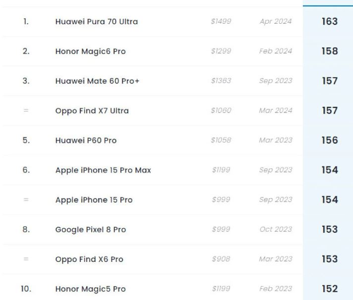 DxOMark'ın son güncellemesiyle birlikte, Huawei Pura 70 Ultra modeli en iyi kameralı telefon unvanını kazandı. Bu model, 163 puanla zirveye yerleşerek, Honor Magic 6 Pro modelinin yerini aldı. Huawei Pura 70 Ultra, son teknoloji kamera özellikleriyle donatılmıştır ve yüksek çözünürlüklü fotoğraflar ve videolar çekebilmektedir.