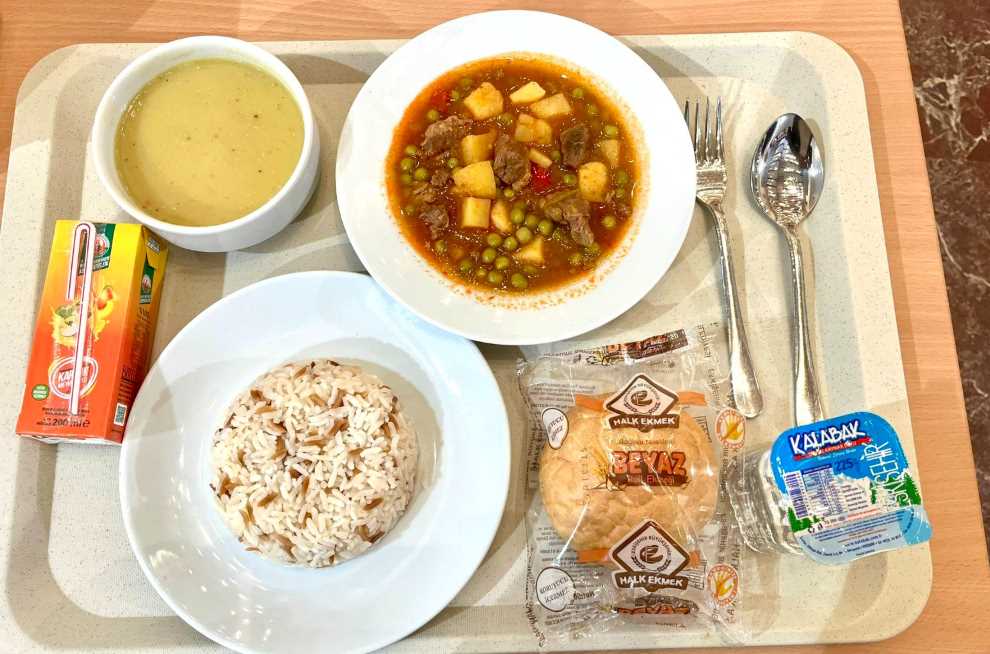 Restoranın bugünkü menüsünde mercimek çorbası , etli bezelye , pilav , meyve suyu , kalabak su ve halk ekmeği bulunuyor. Menü, sadece 65 TL'ye satılıyor.