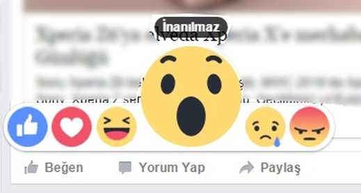 Facebook Reactions olarak adlandırılan bu yenilik ile artık bir gönderiyi sadece beğenmek zorunda kalmıyorsunuz. İfade edebileceğiniz altı farklı durum var. Bunlar sırasıyla, Beğen, Muhteşem, Hahaha, İnanılmaz, Üzgün ve Kızgın şeklinde. Önümüzdeki günlerde daha zengin ifadelerin eklenmesi de söz konusu olabilir.