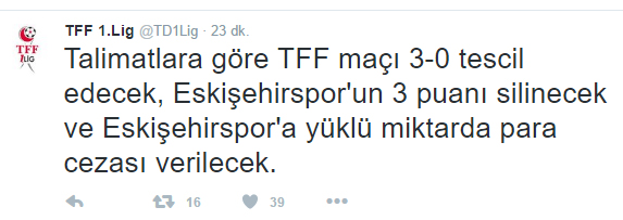 Yaklaşık 15-20 dakikalık kaosun ardında Eskişehirspor yeniden sahaya çıktı. Alpay Özalan, oyuncularını sahaya yolladı. Ancak hakemler sahaya çıkmadı. Bu gelişmenin ardından iki takım soyunma odasına gitti ve mücadele yarıda kaldı.