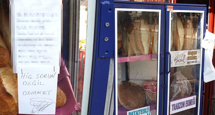 İlçede, emekli olduktan sonra 15 yıldır esnaflık yapan Çiftçi, öğrencilerin çekinmeden ekmek almaya devam edebilmeleri için, bulduğu notun altına "Hiç sorun değil devam et." notunu yazdı.