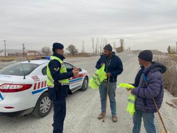 Afyonkarahisar’Da Jandarma Trafik Timleri Tarafından Karayolunda Hayvan Sürülerinin Daha Güvenli Geçişini Sağlamak Amacıyla Çobanlara Reflektif Yelek Dağıtımı Yapıldı