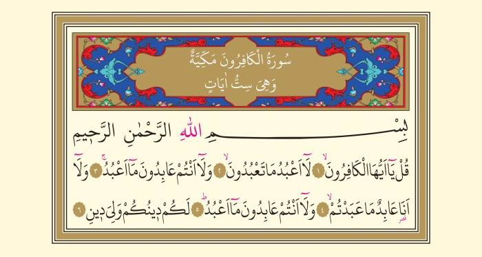 Yukarıdaki surede, Kâfirûn Suresi'nin tamamı yazılıdır. Ancak, bu yazılış tek başına surenin anlaşılması için yeterli değildir. Surenin Türkçe anlamını incelemek daha fazla bilgi sağlayacaktır.