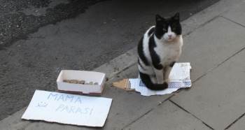 Kaldırımda mama parası bekleyen kediyi gören şaşıp kalıyor!