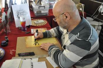 Kütahya’da bulunan bir turizm otelinde açtığı tezgahta, ailesine, arkadaşlarına güzel yazılarla dolu hediyeler almak isteyen sanat dostlarını bekleyen Ali Şen, aynı zamanda burada, çekmiş olduğu birbirinden güzel doğa resimlerini de sergiliyor.