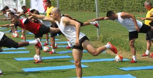 Eskişehirsporlu futbolcular yorucu antrenmanların ardından kendi aralarında yaptıkları...