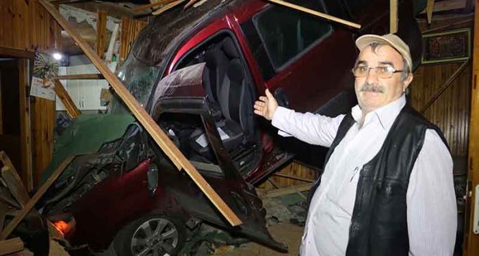 Uyuduğu esnada odaya giren araç ile şoka girdiğini söyleyen Gürkan Adalı ise, “Ben bu odada yatıyordum zaten. 15 dakika oldu olmadı lavaboya gidip içeri odama geçtim. Daha dalmamıştım ki araba uçmuş. O şeyle kalktım baktım araba mı uçmuş diye bir şey parlıyor. Telefonun flaşını bir yaktım araba evin içinde duruyor yani. 10 dakika önce kalkmasaydım üzerime uçacaktı. Araçtakileri gördüm, polise de söyledim. 2-3 ayda bir araç giriyor. Misafirden çok araç geliyor bizim evimize” diye konuştu.