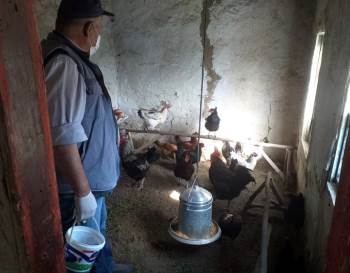 Akkoyun’un, karantinada altına alınan Aşağıköy’de bahçeli evinin kümesindeki, 28 adet tavuk ve köpeğinin bakımının yapılmasını istemesi üzerine Tarım ve Orman İl Müdürlüğü yetkilileri köyde yaşayan emekli Erol Gürler ile irtibata geçildi. Köy Muhtarı Salih Yıldız ile birlikte Akkoyun’un kümesine giden Gürler, tavukların ve köpeğin yemlerini vererek, bakımlarını yaptı.