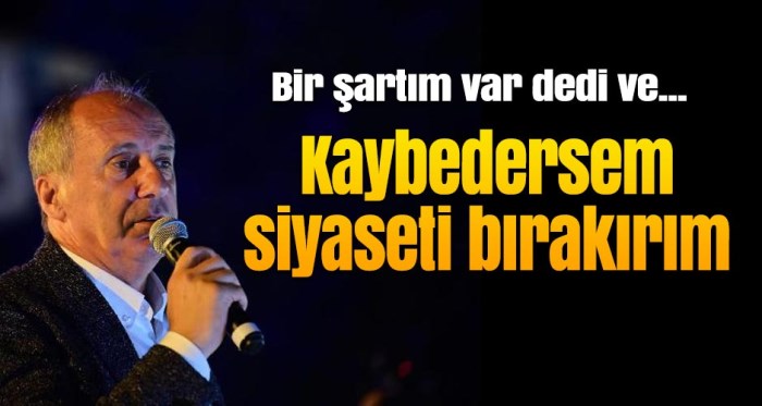 Cumhurbaşkanı Erdoğan'ın meydanlarda kendisine bir çağrıda bulunduğunu belirten İnce, "Bana bir çağrıda bulunuyor, 'İnce, birinci çıkamazsan siyaseti bırakacak mısın?' dedi bana bugün. Erdoğan, sana sesleniyorum, iddialı insanları severim. Sana söz veriyorum bu seçimi kaybedersem siyaseti bırakacağım, söz. Ama bir şartım var. İstediğim bir televizyon kanalında benimle çık ondan sonra. Kanalı sen seç, sunucuyu sen seç, saatini sen seç, gününü sen seç, yanına 200 tane danışman al yetmedi prompter al, karşıma çık. Senden bunu istiyorum. Eğer bunu yaparsan söz veriyorum sözümün arkasındayım ama bun yap." diye konuştu.