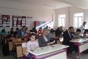 Okul Müdürünün nezaretinde, iki öğrencinin çikolata ve kolonya ikramıyla karşılanan Kaymakam Çiçek ve beraberindekiler, 4/B sınıfında öğrencilerle bir araya gelerek 15 dakika boyunca kitap okudular.
