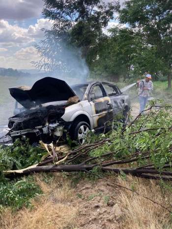 Afyonkarahisar-Ankara karayolundan kontrolden çıkarak şarampole yuvarlandıktan sonra alev topuna dönen otomobil sürücüsü son anda kurtarıldı.