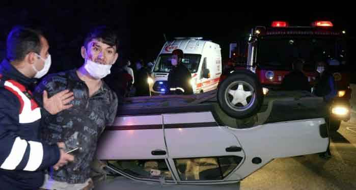 Sakarya D650 karayolunda alkollü sürücünün idaresindeki otomobil kontrolden çıkarak takla attı. Kazanın haber verilmesi üzerine bölgeye gelerek yaralı sürücüyü kurtaran ekiplere saldıran alkollü sürücü sakinleştirilemeyince, kelepçe takılarak gözaltına alındı