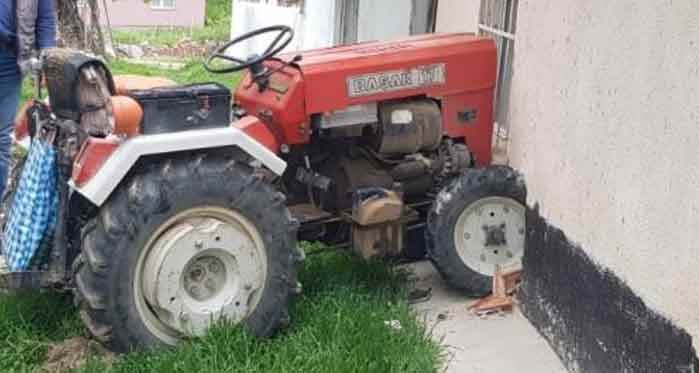 Afyonkarahisar’ın Dinar ilçesinde 88 yaşındaki adam kullandığı traktörün kontrolünü kaybedince kendi evine girdi. Çarpmanın etkisi ile aracın lastiğinin biri evin duvarının içinde kaldı.