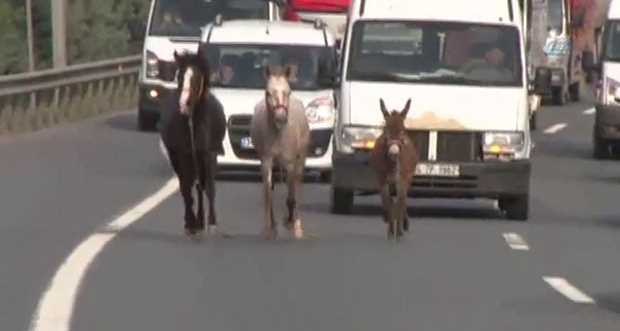 Kocaeli’nin İzmit ilçesinde bağlı bulundukları kazıklardan kurtulan iki at ve bir eşek, TEM otoyolu ile D-100 karayolunu adeta bir birine kattı. İlk olarak Kandıra yolu üzerinden merkeze gelen 3 hayvanı gören sürücüler şaşkına döndü. Buldukları boş bir alanda otlayan hayvanlar, yaklaşık 5 dakika sonra bu kez otogar istikametine koşmaya başladı.