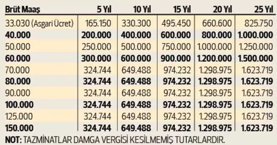 Yeni rakamlarla birlikte örnek hesaplamalar da dikkat çekiyor. Asgari ücretle çalışan bir kişi, aynı işyerinde 5 yılını doldurduğunda yaklaşık 165 bin lira, 10 yıl çalıştığında ise 330 bin liranın üzerinde kıdem tazminatına hak kazanıyor. Brüt ücreti tavan tutar seviyesinde olan bir çalışan için bu rakamlar çok daha yüksek. Örneğin 10 yıl boyunca aynı işyerinde çalışan bir kişi, yaklaşık 649 bin lira tazminat alabiliyor. Uzun süreli çalışanlarda toplam tutar 1 milyon lirayı aşabiliyor. Ancak bu ödemelerden yalnızca binde 7,59 oranında damga vergisi kesintisi yapılıyor.
