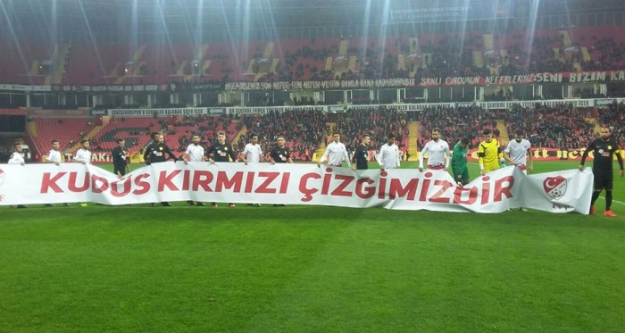 Amerika Birleşik Devletleri (ABD) Başkanı Donald Trump'ın Kudüs'ü İsrail'in başkenti olarak tanıdıklarına dair sözlerine tepkiler devam ediyor. TFF 1. Lig'in 15. haftasında evinde Gaziantepspor'u ağırlayan Eskişehirspor'da, oyuncular tepkilerini sahaya çıktıkları pankart ile gösterdi. Tribünlerden büyük desteğin geldiği pankartın üzerinde, "Kudüs Kırmızı Çizgimizdir" ifadesi yer aldı.