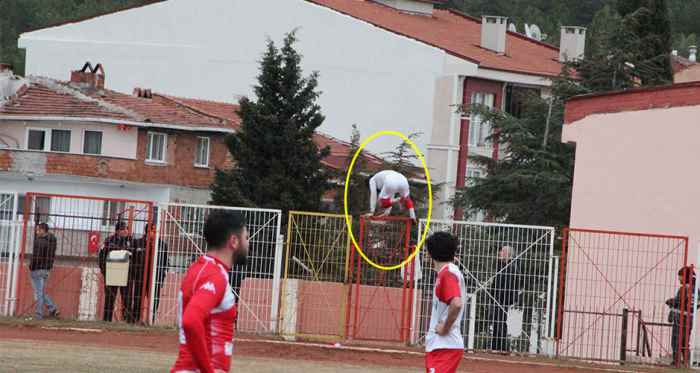 1299 Edebali Kulübü - Bilecikspor karşılaşmasının 60. dakikasında kırmızı kart oyuncu, soyunma odasına giden kapı kitli olunca demir kapının üzerinden atlamak zorunda kaldı.